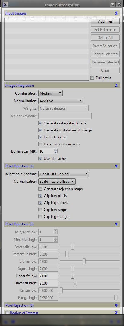 Pix Insight Now we'll cover image integration, making the master images. This process will be repeated for each different type of filter used for your images. In this case I'll do the luminance image first. Open the "Image Integration" process found using either the left "Process Explorer" tab and going down to "Image Integration" and opening that tool or using the "Process" , "All Processes" on the menu bar. Again you are given choices for how to combine your image data. You first add your data to be combined by clicking on the "Add Files" button and navigating to your aligned data folder and choosing all the images to be combined. In this case I'll pick my luminance images. They will be numbered and show in the dialog box. Next you choose if the data is to be Average, Median, Minimum, or Maximum combined. Average will result in a higher signal to noise ratio but I'll often use median if I have any satellite or plane trails in any of the images. Next you would choose your process for normalization of the images and how the data is weighed. I use Additive for normalization and noise evaluation, the defaults, for these choices but you can certainly experiment. Remember what I had said before about dialog box choices, "First and foremost, it is important to note that when any process is open, pausing the cursor over any option choice will result in a brief explanation of that box. Keep this in mind when given choices to choose." There are five options below that to choose as wanted. The next step is choosing a pixel rejection process. There are three pixel rejection sections. The first deals with the algorithm used while the second lets you adjust the parameters for each algorithm. I suggest using the default setting and see how they work and then adjust up/down as necessary. I have always left the third section alone. In most all of the processes you have two to three choices to perform the process. The triangle shape is for new instance of the process, the round circle is for global apply and the box is apply. Some also have an icon that looks like a spinning top which stands for real preview. The triangle is used by dragging it onto the image you are working on to apply what changes you made. Conversely you can make the adjustments and hit the square box icon and apply the settings. If you are working on more than one image such as in image alignment you would use the round circle icon for global apply for all images. Juan Conejero, a major Pix Insight